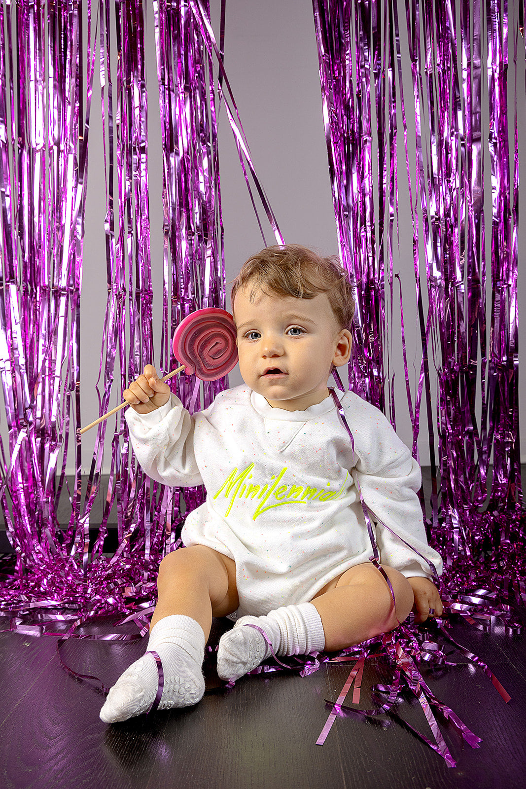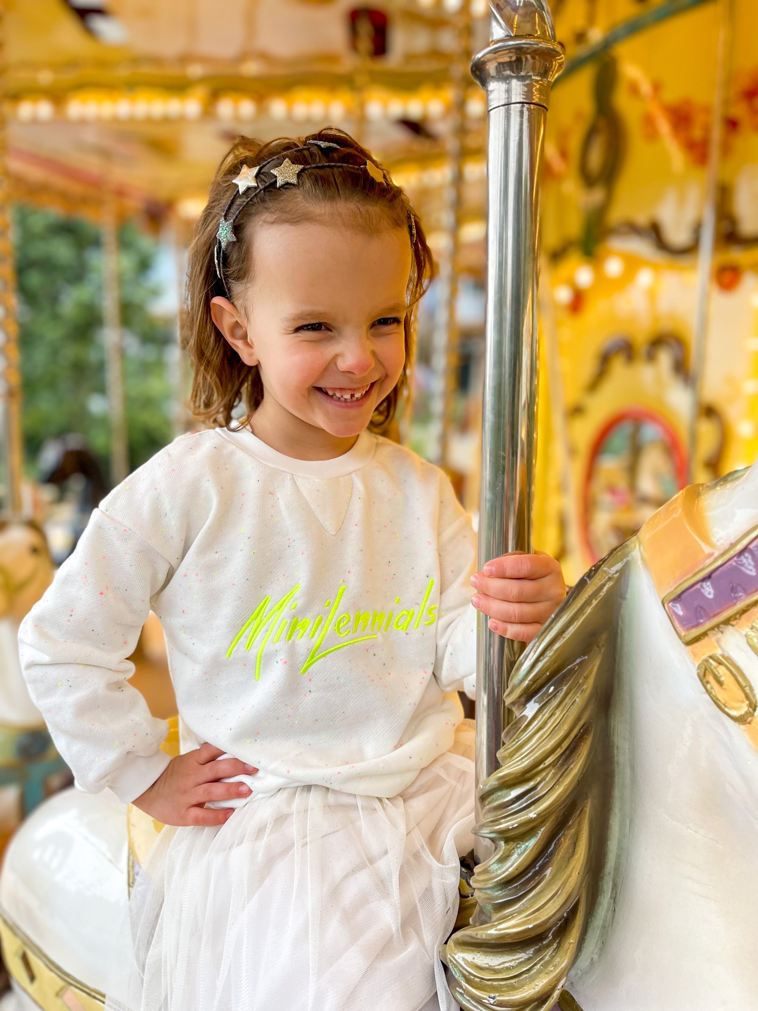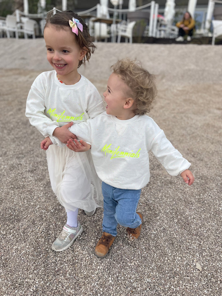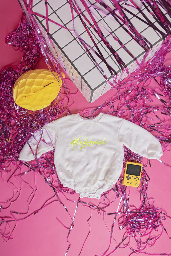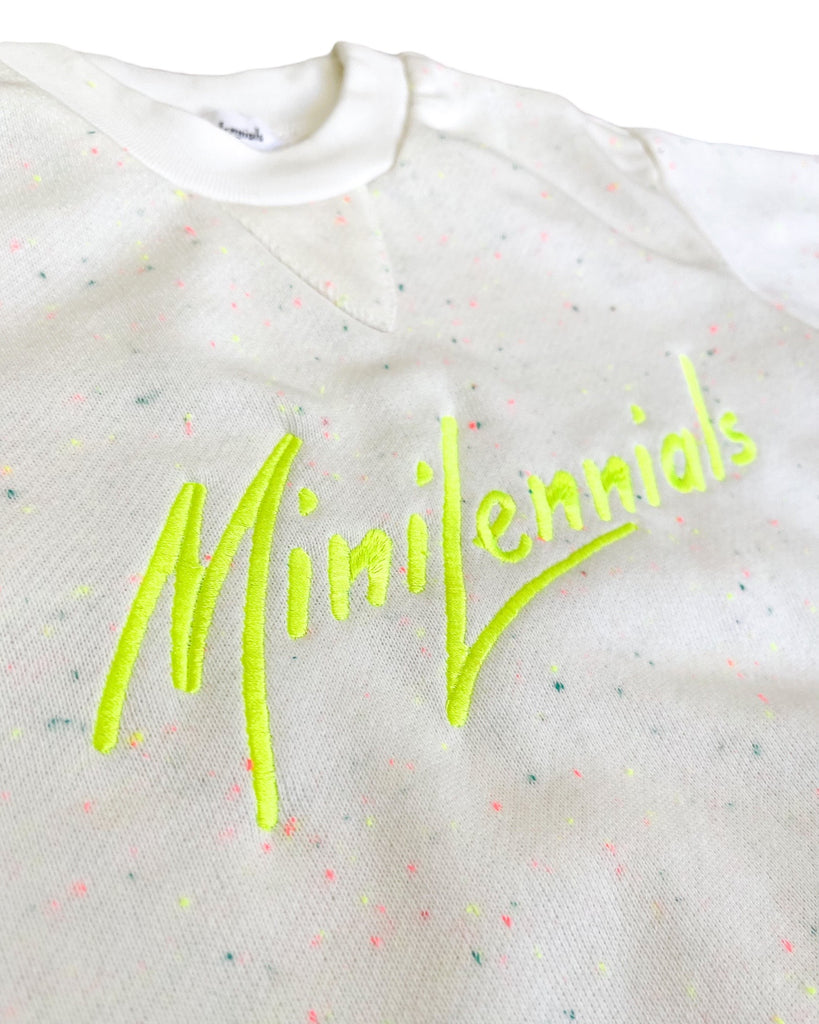 The MiniLennials logo baby sweaters and rompers are made of 100% cotton and rock neon rainbow speckles.