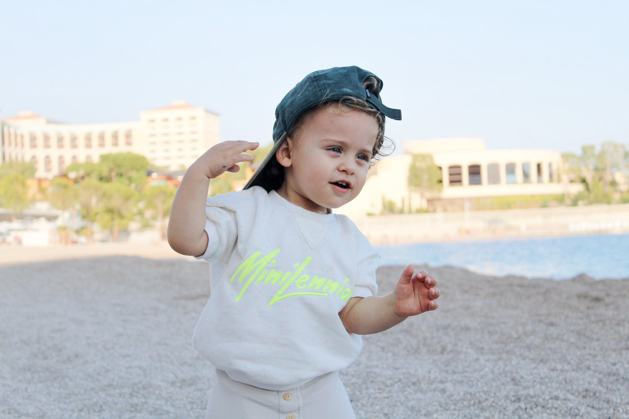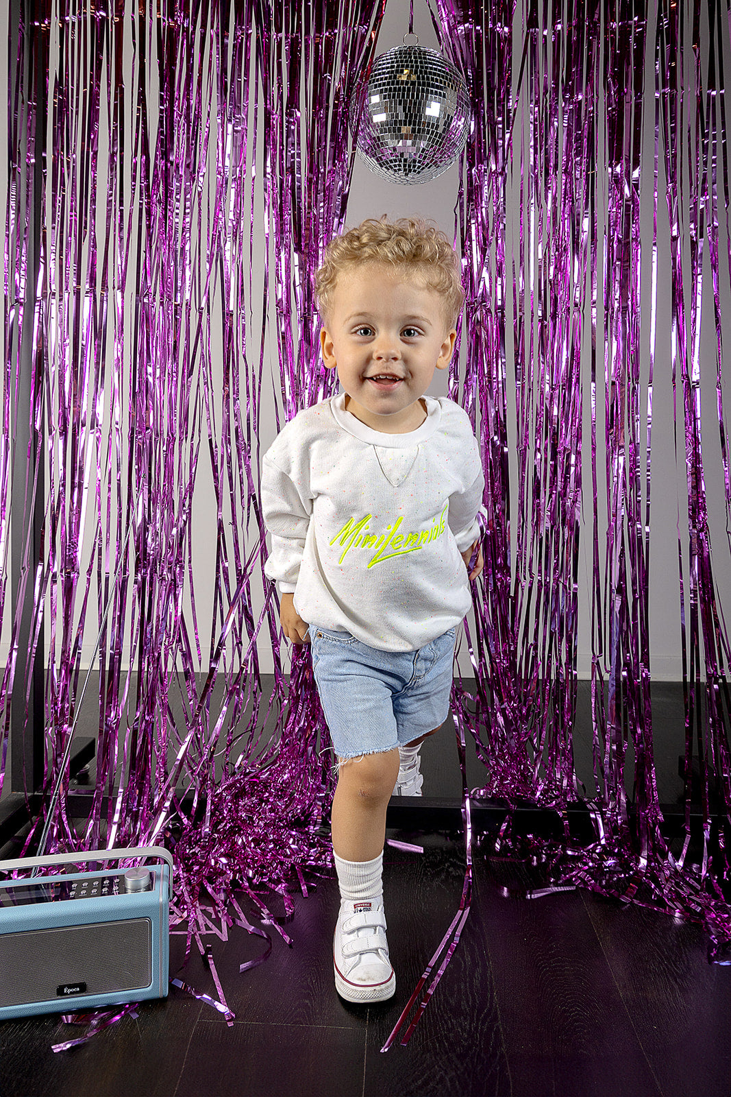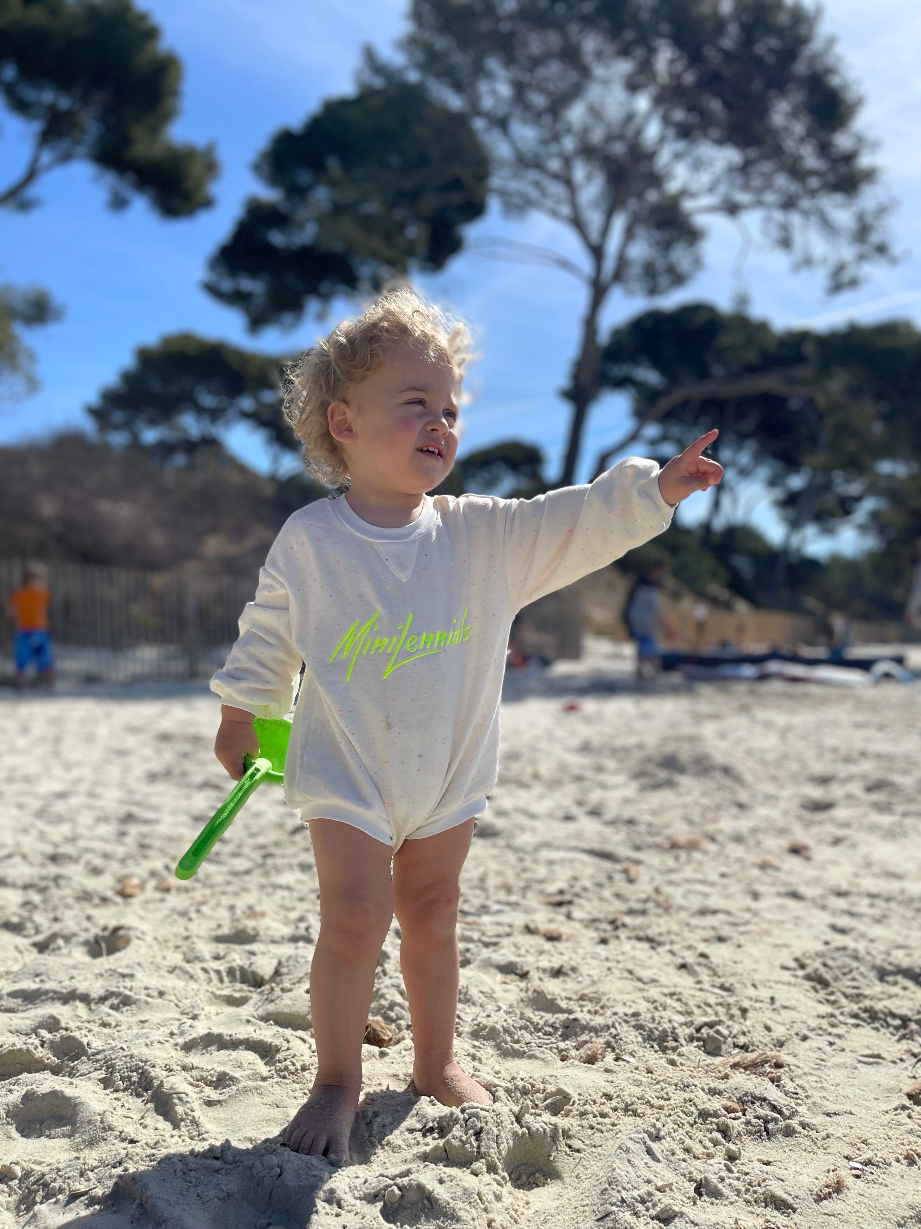 The MiniLennials logo baby sweaters and rompers are made of 100% cotton and rock neon rainbow speckles.